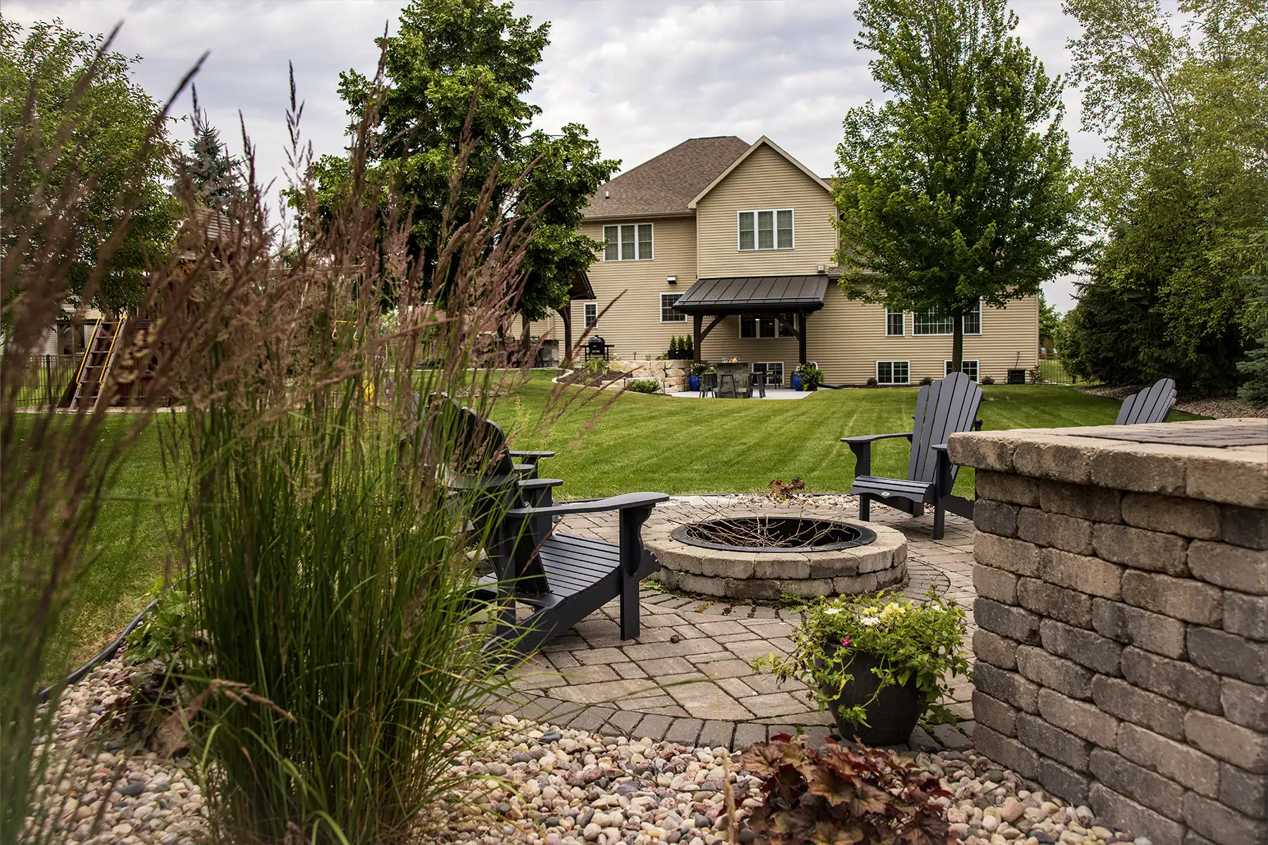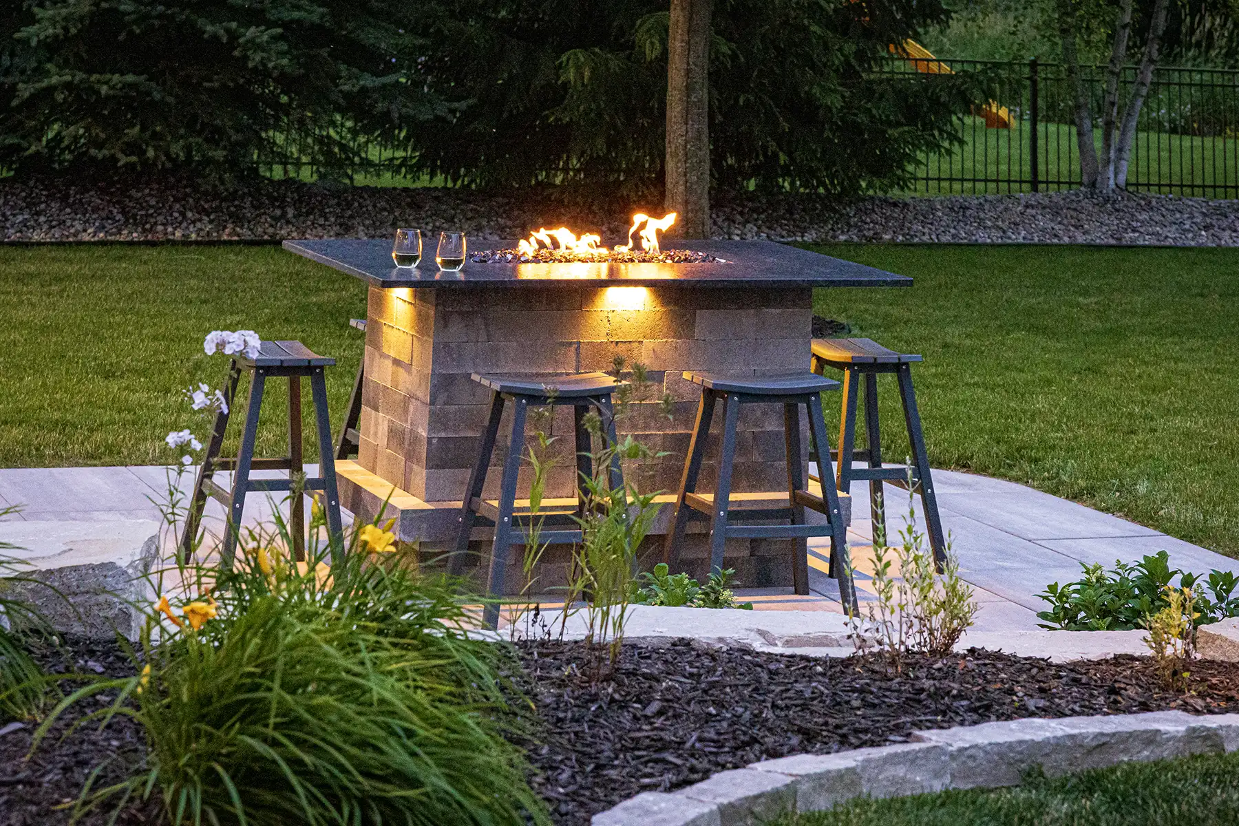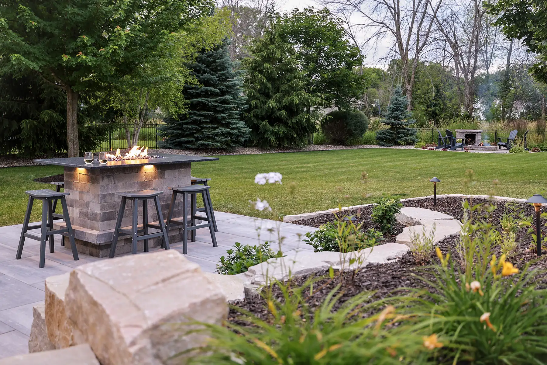 This couple wanted to create an awesome backyard space to entertain and enjoy the Wisconsin summers. It has everything necessary to throw an amazing backyard party – a built-in-grill, refrigerator, and drawer inserts. This area is completed by a beautiful granite countertop and low voltage LED lighting under the countertop. A pergola finishes the space off and sets it apart from the rest of the backyard – really defining the space. There is even a custom sandbox made from natural outcroppings for the kids to play it. This backyard is the perfect spot to host summer parties!