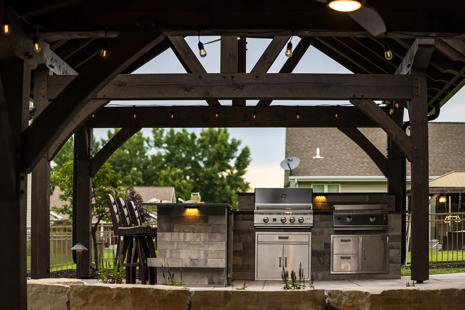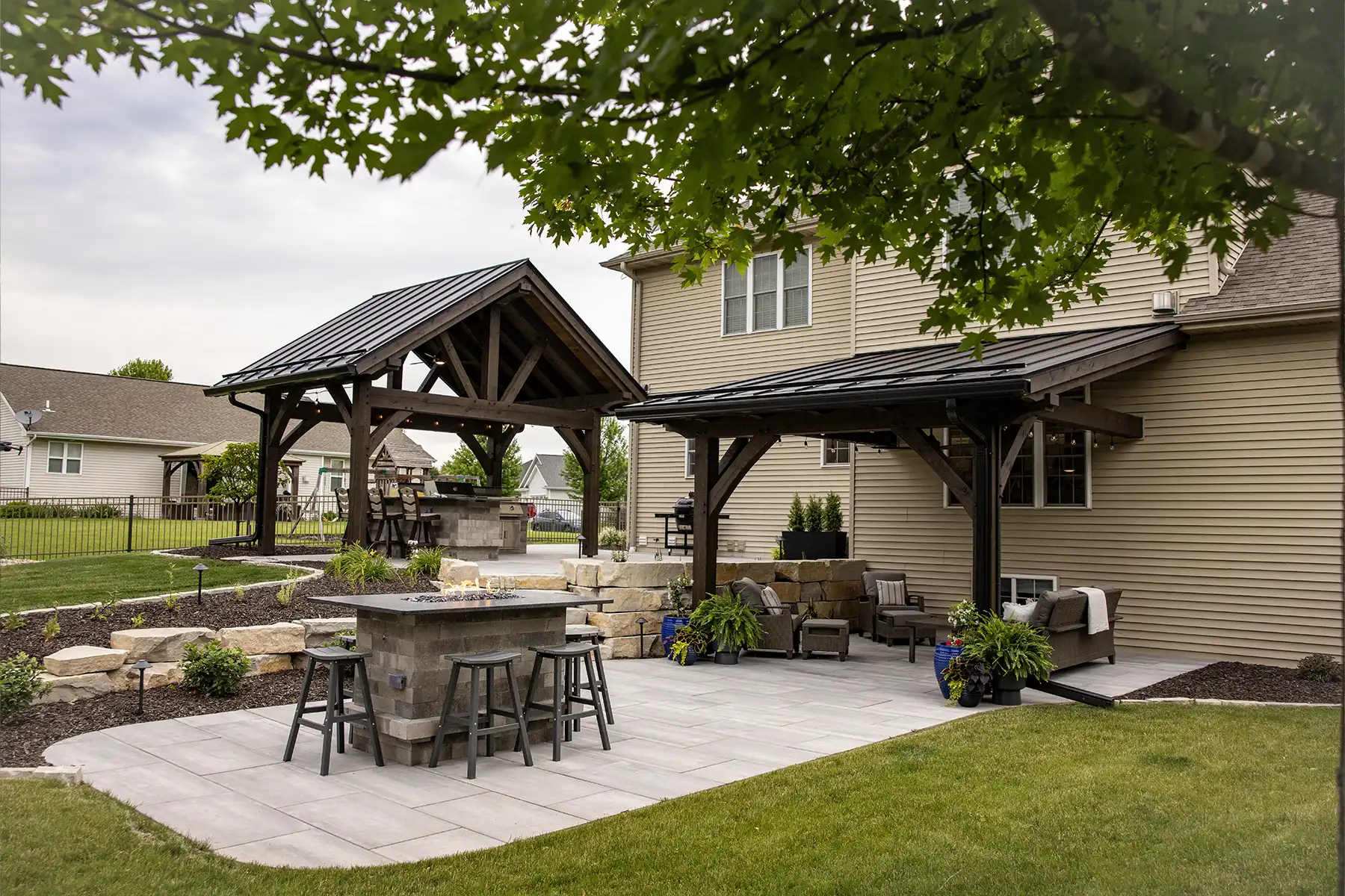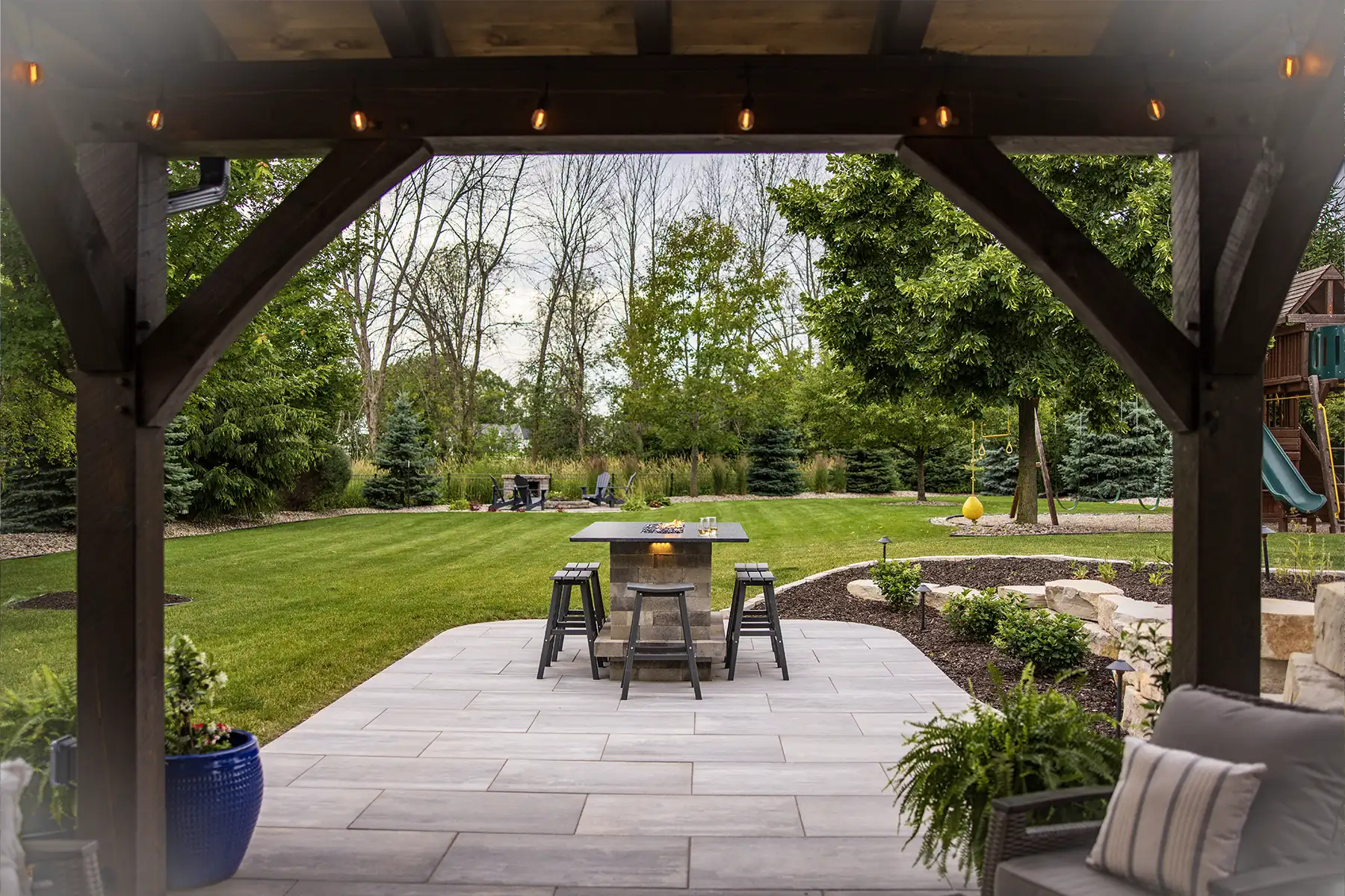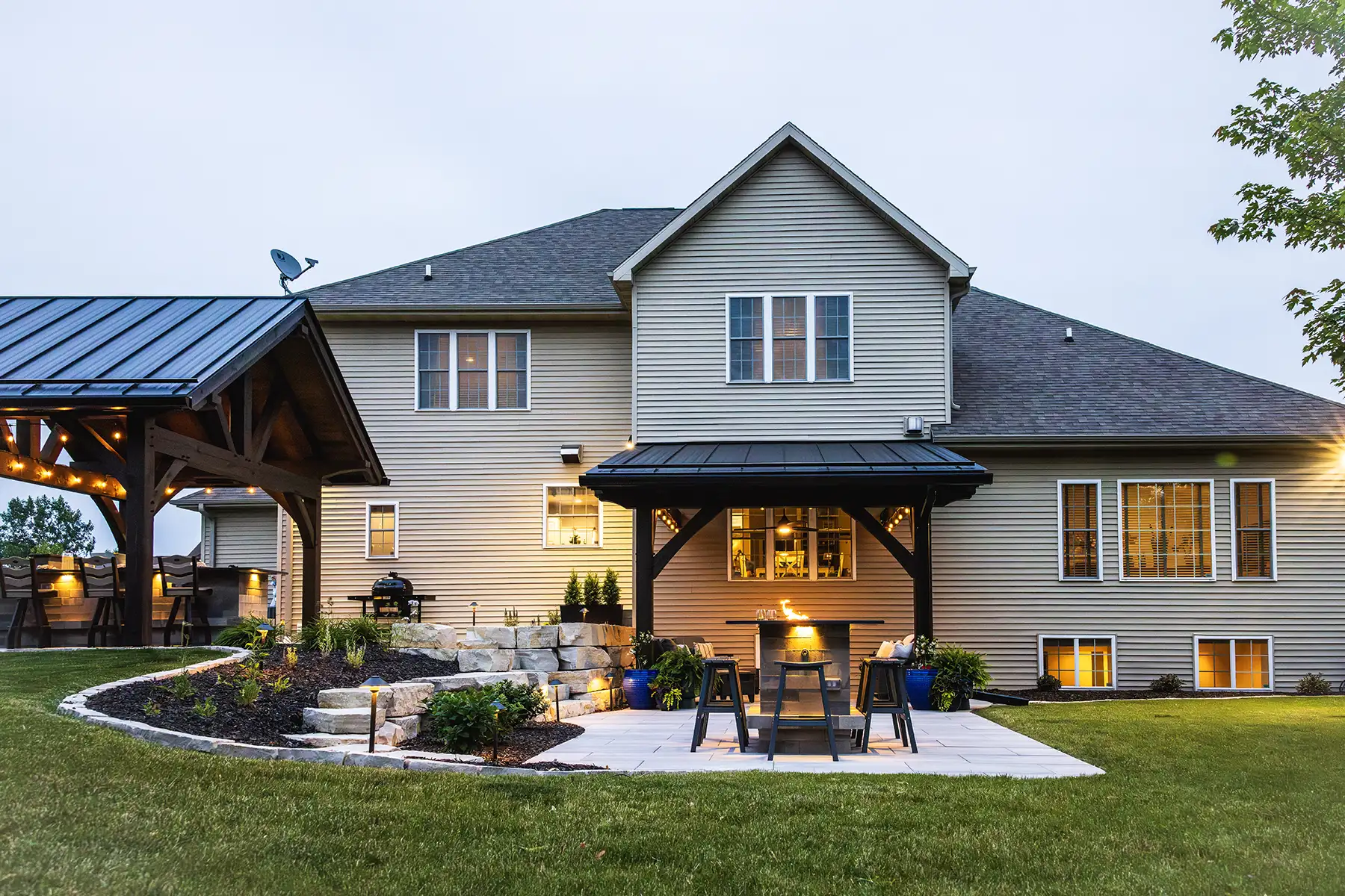 This couple wanted to create an awesome backyard space to entertain and enjoy the Wisconsin summers. It has everything necessary to throw an amazing backyard party – a built-in-grill, refrigerator, and drawer inserts. This area is completed by a beautiful granite countertop and low voltage LED lighting under the countertop. A pergola finishes the space off and sets it apart from the rest of the backyard – really defining the space. There is even a custom sandbox made from natural outcroppings for the kids to play it. This backyard is the perfect spot to host summer parties!